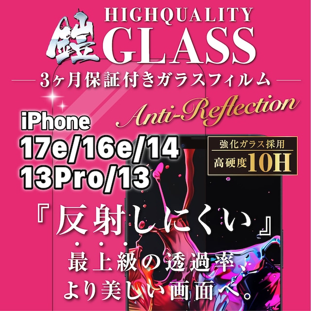 【簡単貼り付けキット付き】iPhone17e/16e/14/13Pro/13用 超光沢(AR) 最上級透過率(高透明+反射防止) 保証付きガラスフィルム『鎧』全面フルカバー