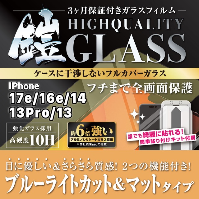 iPhone17e/16e【ブルーライトカット&反射防止(マット)】3カ月保証付き『ガラスフィルム鎧』平面フルカバー