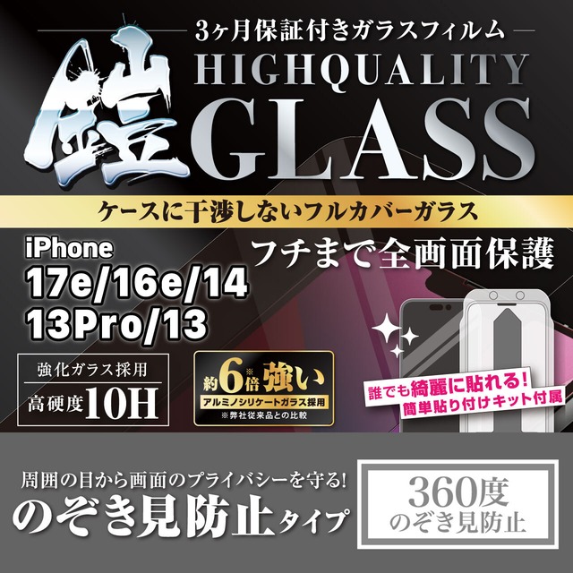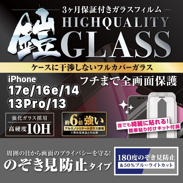 <貼り付けキット付き>iPhone17e/16e/14/13pro/13【のぞき見防止】3カ月保証付き『ガラスフィルム鎧』全面フルカバー(黒フチタイプ)
