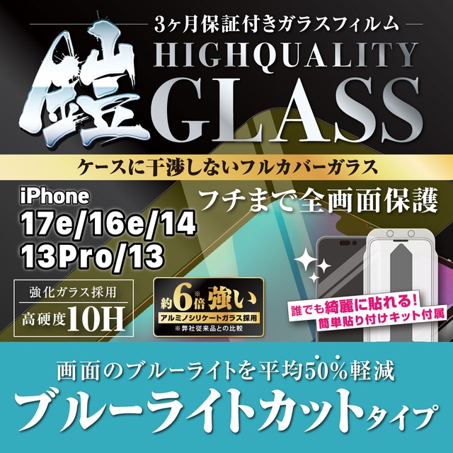 iPhone17e/16e【ブルーライトカット】3カ月保証付き『ガラスフィルム鎧』平面フルカバー