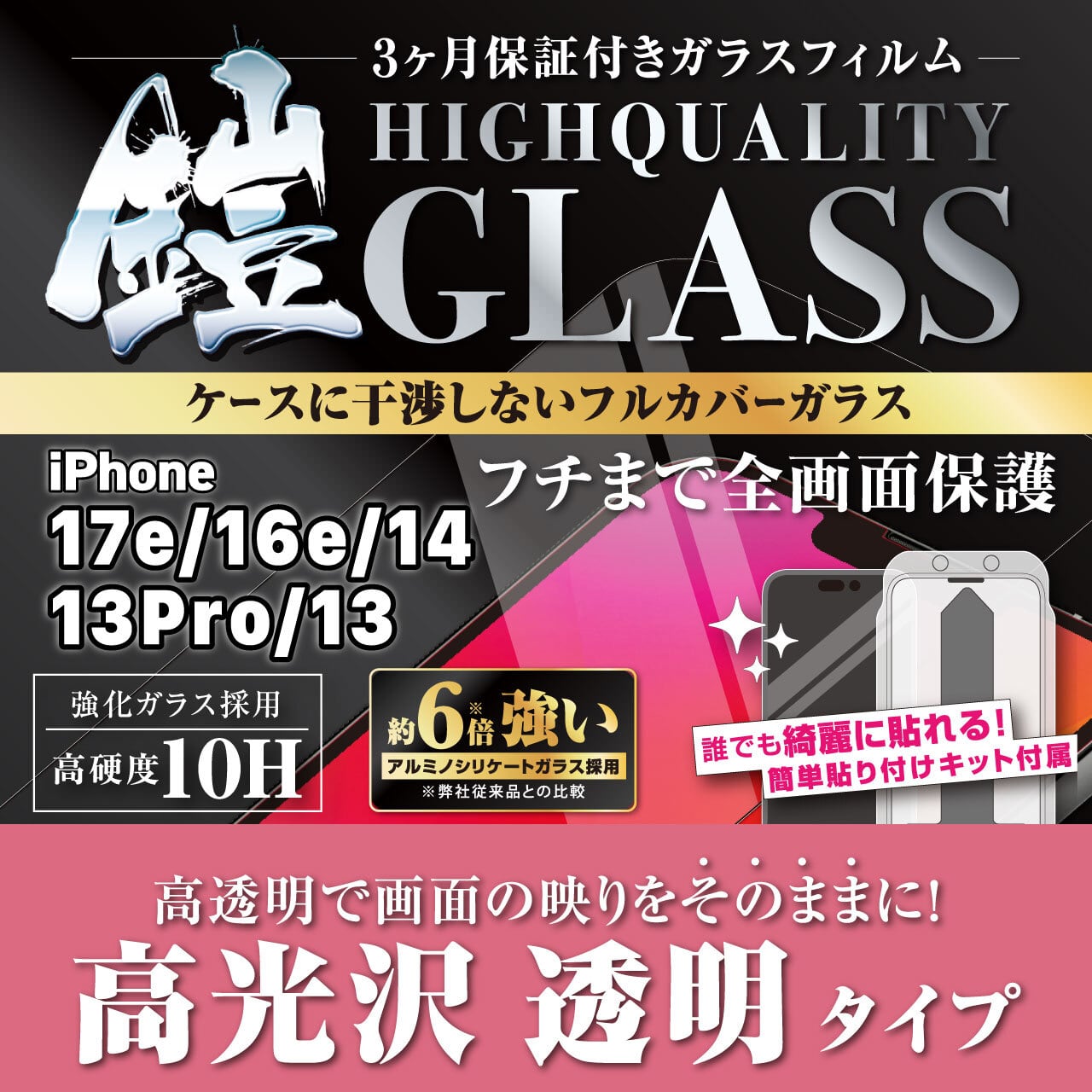 <貼り付けキット付き>iPhone17e/16e/14/13pro/13【高光沢】3カ月保証付き『ガラスフィルム鎧』全面フルカバー(黒フチタイプ)