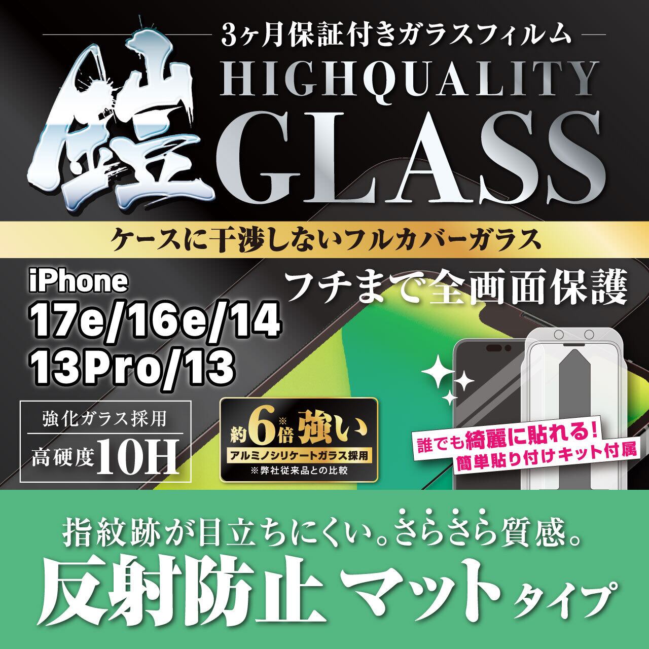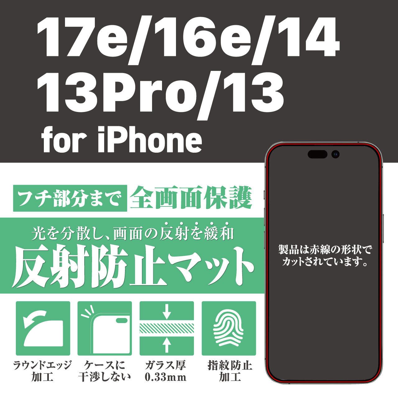 <貼り付けキット付き>iPhone17e/16e/14/13pro/13【反射防止】(マット)3カ月保証付き『ガラスフィルム鎧』全面フルカバー(黒フチタイプ)