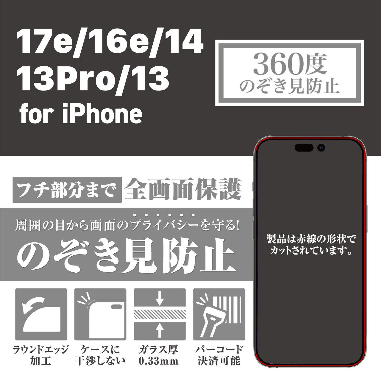 <貼り付けガイド付き>iPhone17e/16e/14/13pro/13【360度のぞき見防止】3カ月保証付き『ガラスフィルム鎧』全面フルカバー(黒フチタイプ)