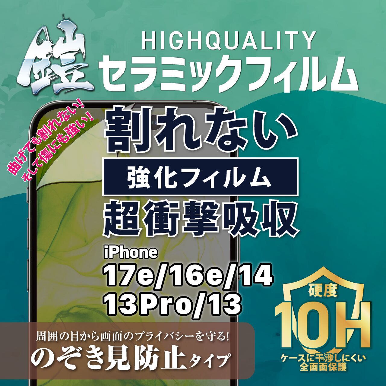 iPhone17e/16e/14/13pro/13【のぞき見防止】割れないセラミックフィルム『鎧』全面フルカバー