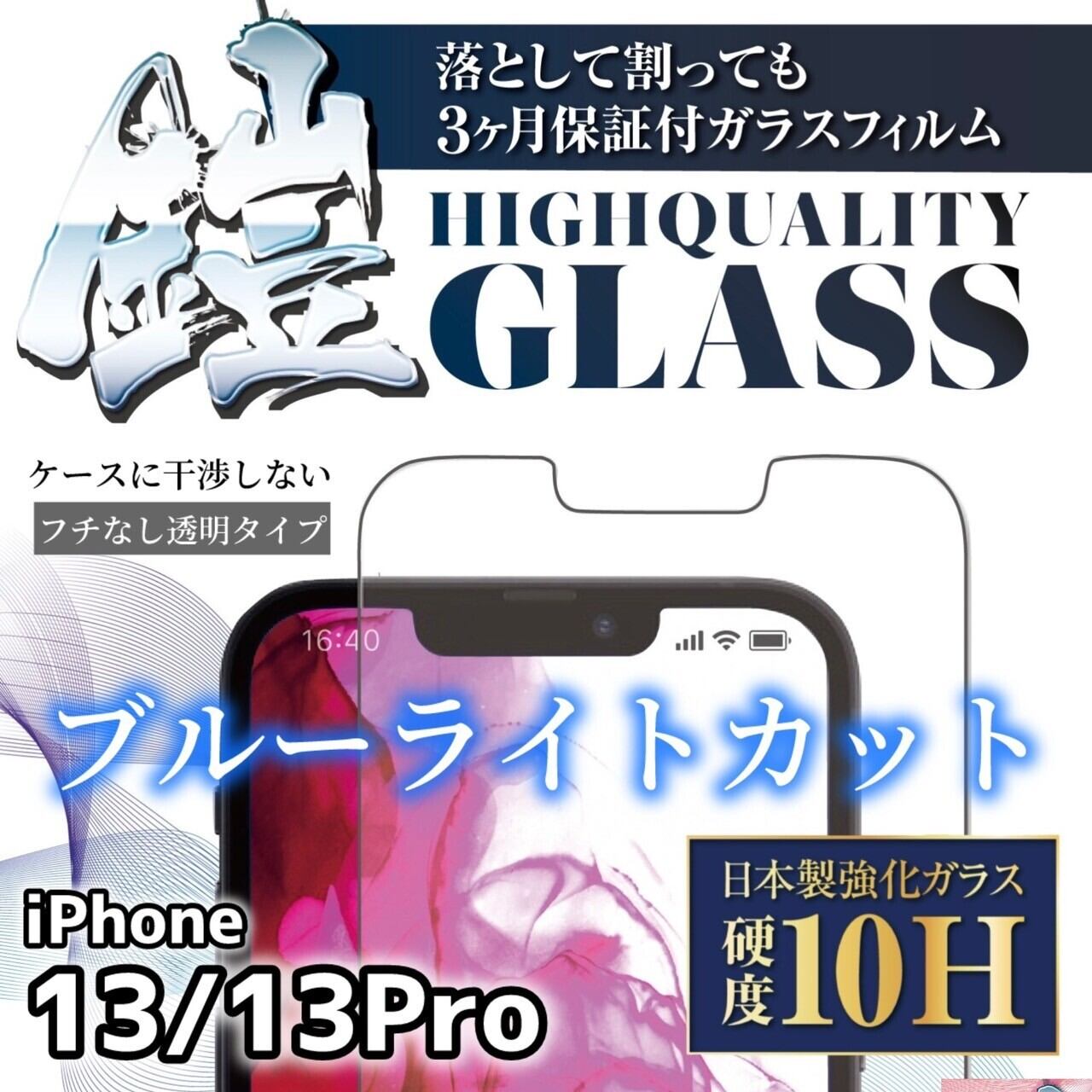 iPhone13/13Pro【ブルーライトカット】保証付きガラスフィルム『鎧』平面タイプ