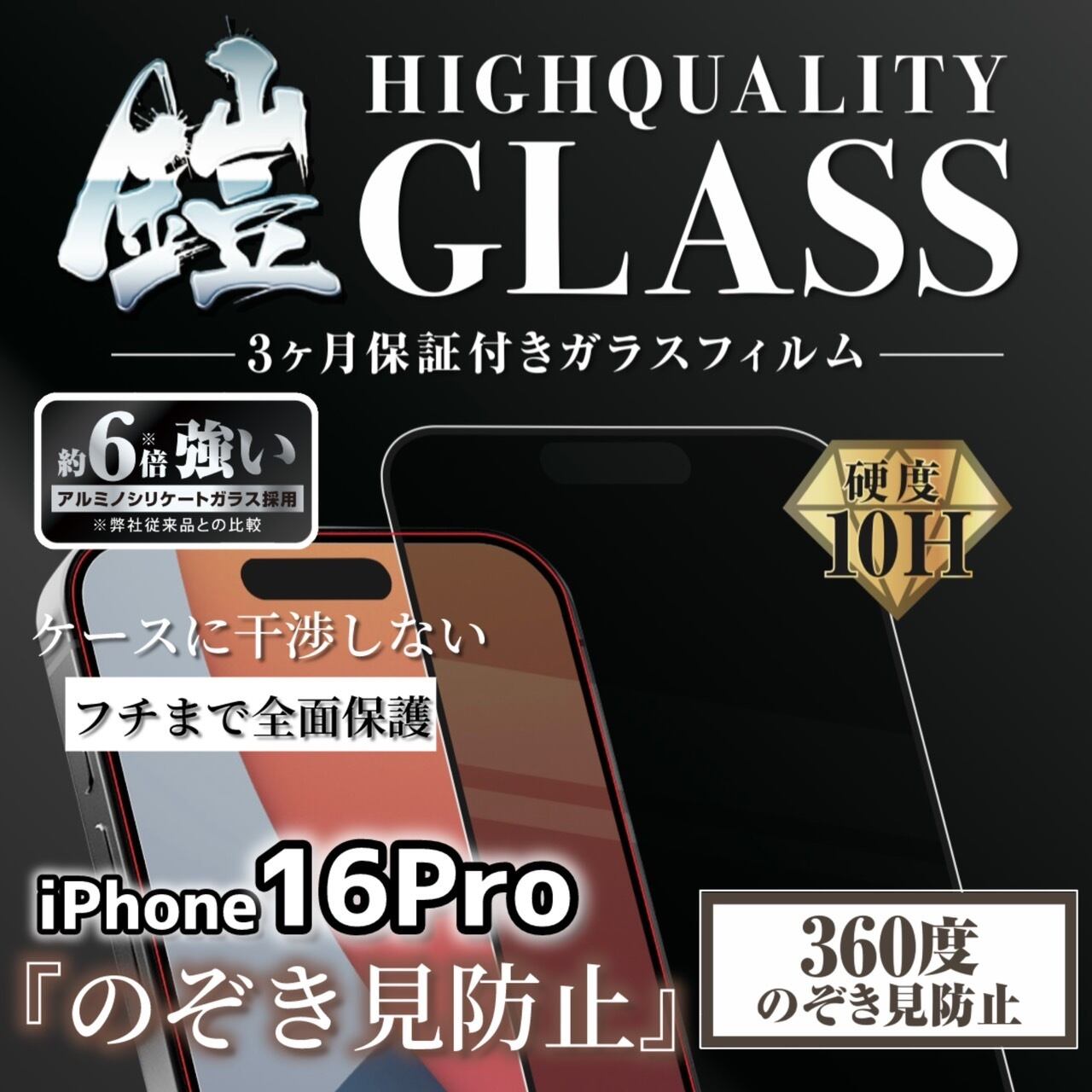 <貼り付けガイド付き>iPhone16Pro【360度のぞき見防止】3カ月保証付き『ガラスフィルム鎧』全面フルカバー(黒フチタイプ)