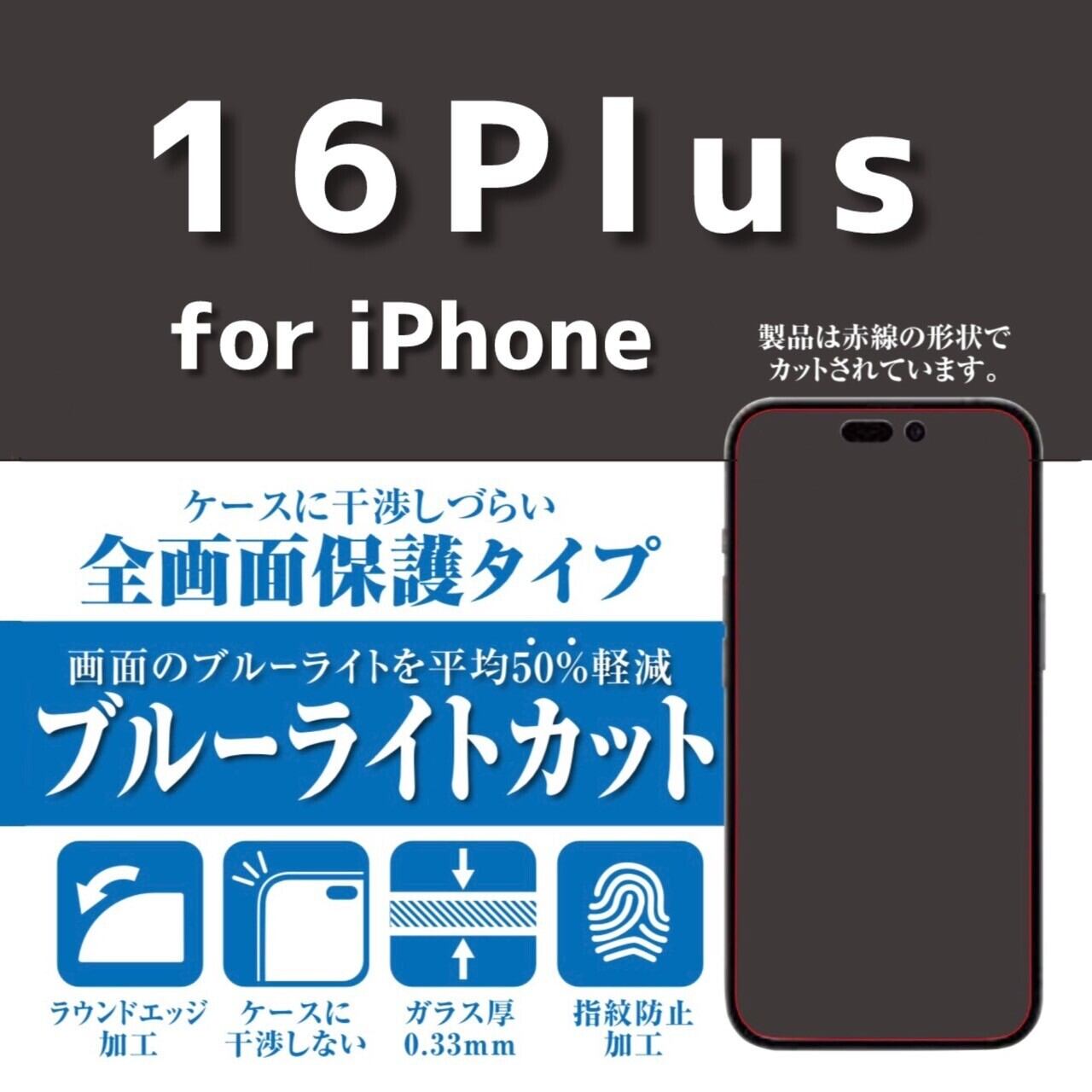 <貼り付けキット付き>iPhone16Plus【ブルーライトカット】3カ月保証付き『ガラスフィルム鎧』全面フルカバー(黒フチタイプ)