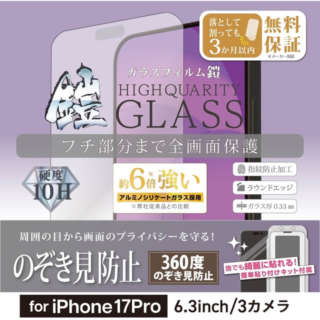 iPhone17Pro【360度のぞき見防止】3カ月保証付き『ガラスフィルム鎧』全面フルカバー(黒フチタイプ)<貼り付けガイド付き>